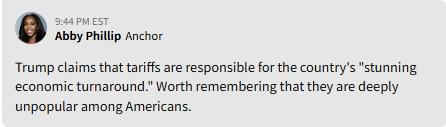 特朗普形容其关税政策为美国经济“惊人复苏的功臣”。但CNN主持人艾比·菲利普分析称,这一政策在美国民众中“极为不受欢迎”。
