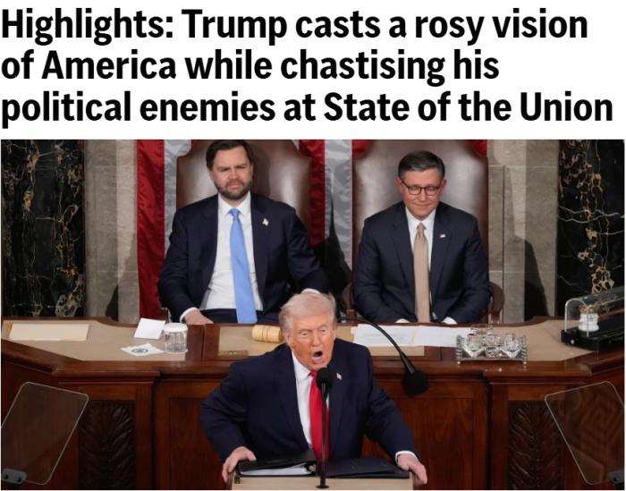 中新网2月25日电 “美国民众依旧忧心忡忡:特朗普对国家的乐观描绘,与民众的真实情绪形成了鲜明反差。”美国总统特朗普当地时间24日晚发表国情咨文演讲后,美联社如此评论道。