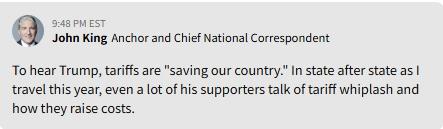 “在特朗普口中,关税正在‘拯救我们的国家’。而我今年走访各州期间发现,即便是他的众多支持者,也纷纷谈及关税带来的剧烈冲击,以及关税如何推高了各类成本。”CNN记者约翰·金评价道。