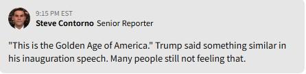 特朗普在演讲中称,“我们的国家回来了。这是美国的黄金时代。”不过,美国记者史蒂夫·孔托诺评论称,特朗普在就职演讲中也有类似表述,但很多人至今并未感受到这一点。