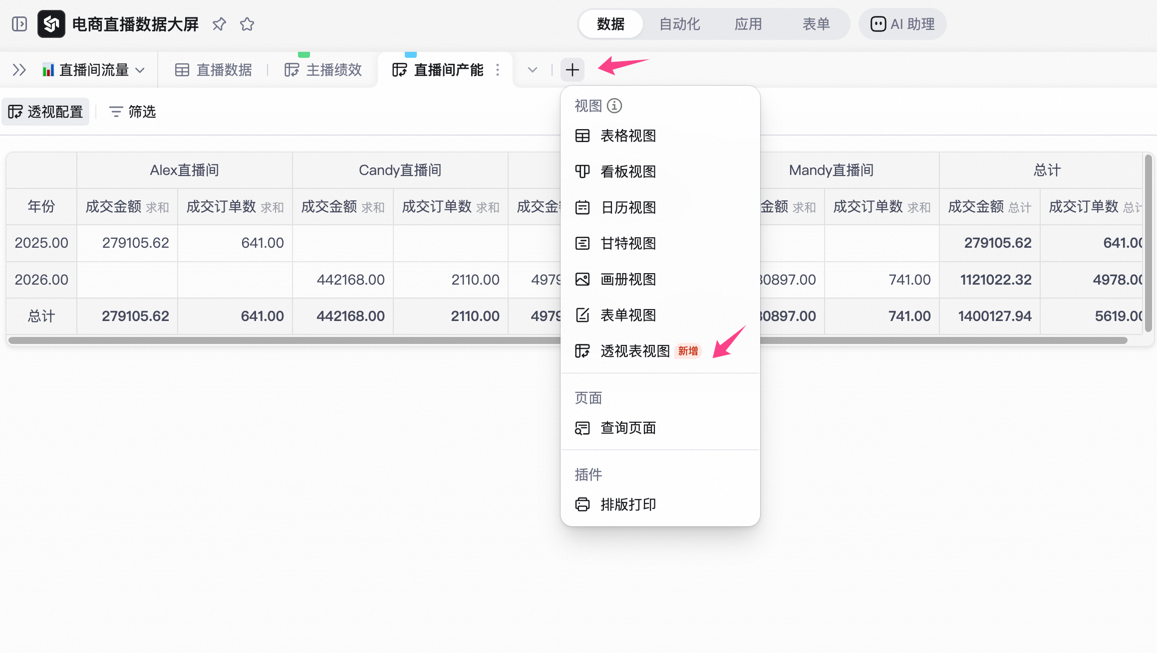 记者体验发现,过去如果要在智能表格原始数据库基础上分析,只能建立多个辅助数据表,汇总数据分析结论。而通过透视表视图,用户无需编写复杂公式或创建辅助表,只需要建立新的视图界面,根据数据分析的目标,通过拖拽字段,即可从海量明细数据中,快速完成多维度数据汇总统计。